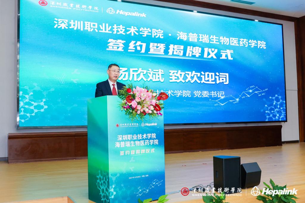 10月26日下午,深圳首個生物醫藥特色產業學院——深圳職業技術學院·海普瑞生物醫藥學院簽約揭牌儀式暨海普瑞生物醫藥學院首屆高峰論壇在學校留仙洞校區同德樓1號會議室舉行。深圳市人民政府副秘書長、一級巡視員產耀東,深圳市市場監督管理局藥品處副處長張天,深圳市科技創新委員會生物科技處副處長王紹文,海普瑞藥業集團董事長李鋰,副總裁單宇、張潔,深圳技術大學藥學院院長賀震旦,深圳市藥師協會秘書長陸喜宇,深圳市生命科學與生物技術協會執行秘書長王艷梅,學校黨委書記楊欣斌、校長許建領出席。儀式由副校長溫希東主持。