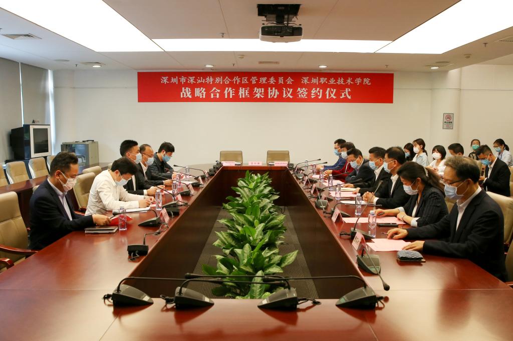 4月10日,深圳市深汕特別合作區管理委員會與我校簽訂戰略合作框架協議,共建深圳職業技術學院深汕校區,打造粵東職業教育高地,為合作區和老區建設提供強有力的人才智力支撐。深圳市委教育工委書記、市教育局局長陳秋明;深圳市發展改革委社會發展處處長陳興;深圳市扶貧協作和合作交流辦合作交流處處長陶宇;深圳市教育局職業與終身教育處處長鐘子榮;深圳市深汕特別合作區黨工委書記產耀東,黨工委委員、管委會副主任蔡轉彎,公共事業管理局局長徐琳,市規和自然資源局深汕管理局局長孫佾;我校黨委書記、校長楊欣斌,黨委副書記、紀委書記王慧,副校長董朝君等領導嘉賓出席。深圳市教育局副局長朱迪儉主持儀式。