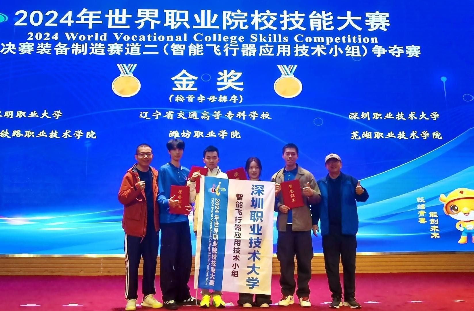 本次大賽由教育部、國家發展改革委、科學技術部等30多個部委單位聯合主辦。智能飛行器應用技術賽項中,來自全國各地共59支參賽隊伍同臺競技,最終6支隊伍獲得金獎,11支隊伍獲得銀獎,13支隊伍獲得銅獎。我校代表隊由來自無人機應用技術專業22、23級4位學生組成,以無人機編隊表演和安全管理為主題進行了項目演練,整個項目包含無人機編隊表演設計與執行、無人機安全管理、無人機特技航拍等7個環節。最終,我校代表隊以高超的技能水平、良好的職業素養、強大的合作能力以及著眼于低空文旅經濟領域的產品創新創意從一眾參賽隊伍里脫穎而出,喜獲金獎。