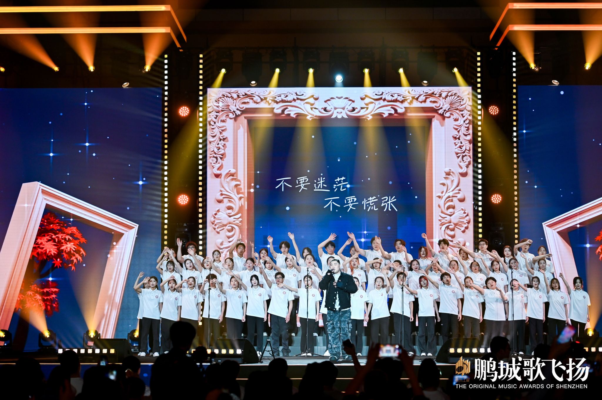 當(dāng)晚,“音樂工程2024年度十佳金曲”“音樂工程2024年度特別獎”“鵬城歌飛揚(yáng)2024年度十佳金曲”“鵬城歌飛揚(yáng)2024年度單項(xiàng)獎”逐一揭曉。眾多深圳原創(chuàng)音樂人登臺演出,為觀眾帶來了一場音樂盛宴。從歡快的《一起跳舞吧》到深情的《追光》,從充滿活力的《18,886》到富有文化特色的《月光照青山》,一首首歌曲展現(xiàn)了深圳原創(chuàng)音樂的多元風(fēng)格和深厚底蘊(yùn)。此外,孤獨(dú)癥兒童演唱的原創(chuàng)歌曲《小蝸牛》令人感動,展現(xiàn)了音樂的治愈力量。晚會最后階段,歌手GooGoo帶領(lǐng)我校60名學(xué)生演唱《不要慌,太陽下山有月光》,將現(xiàn)場氣氛推向最高潮。