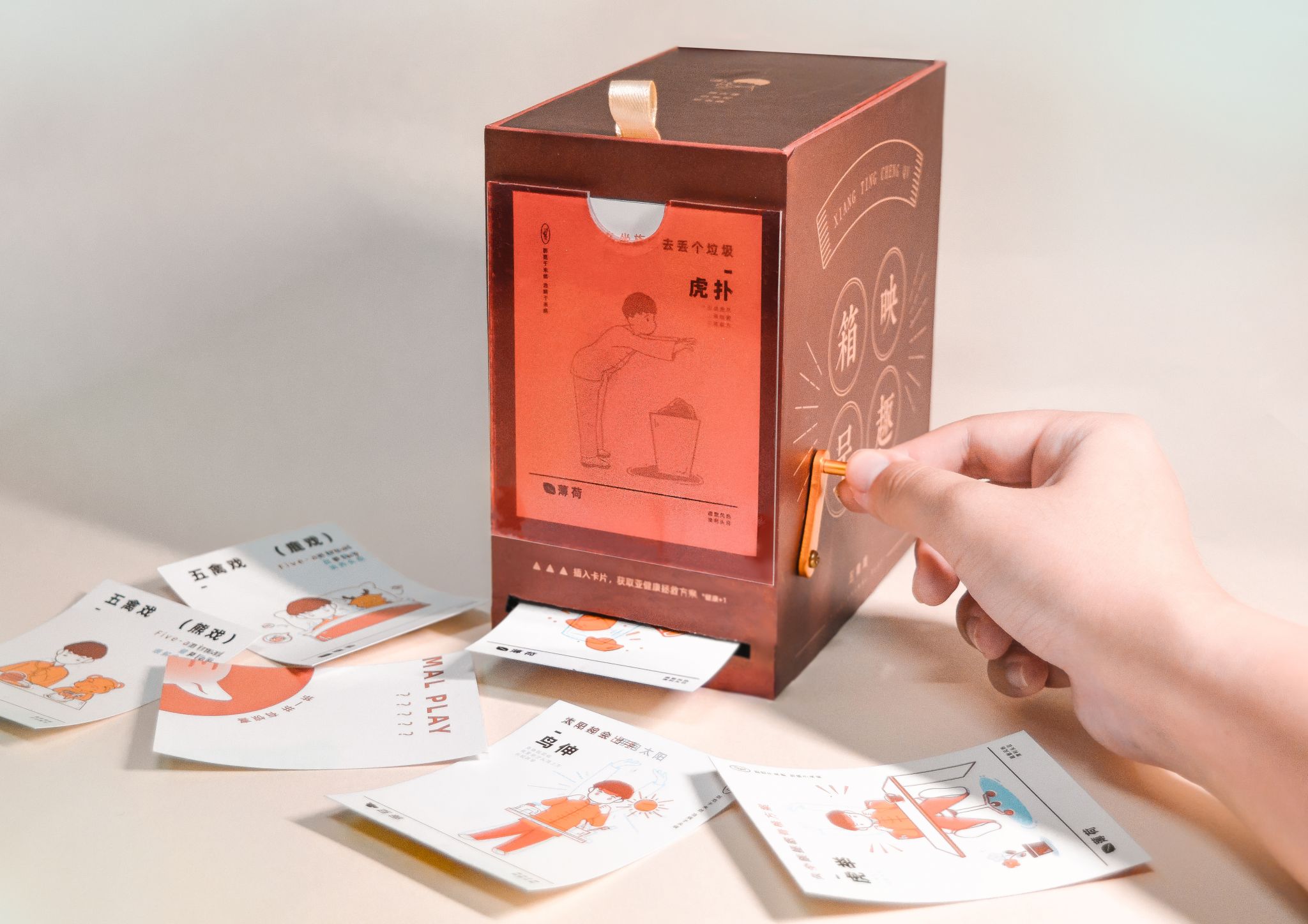 《戲 五禽》的靈感則來源于國家級非物質文化遺產五禽戲。創作團隊將本身具有強身健體功能的傳統招式和日常生活中的場景相結合,配上虎、鹿、熊、猿、鳥的原創IP形象,開發出中國傳統體育主題非遺數字文創作品。“我們設計了許多張不同的小卡片,每張對應五禽戲中的一個招式,把卡片插入箱子,轉動把手,就能透過紅色的亞克力板濾鏡,看到動態版的招式。”負責人張卓欣介紹,“像這個虎爪的動作,本身是五禽戲中的‘虎撲’招式,我們把他和日常生活中的倒垃圾結合在一起,讓大家在輕松之余,做一些簡單的動作來緩解勞累。我們想通過將五禽戲里面的招式變得更加年輕化,讓年輕人更加了解五禽戲,從而在現實生活中愿意接觸、愿意學習五禽戲。”