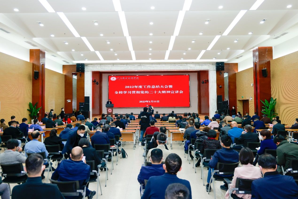 1月11日,學校在留仙洞校區同德樓1號會議室召開2022年度工作總結大會。學校黨委副書記、校長許建領作年度工作總結報告,對2022年工作進行全面總結,并部署2023年重點工作。會議由副校長董朝君主持,全體校領導出席。全體中層干部、教師代表參加現場會議,全校千余名教職工參加線上會議。