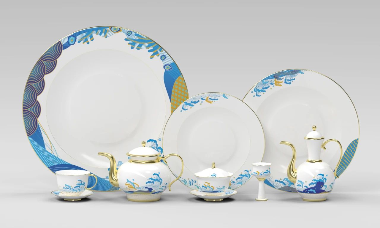 我校與國瓷永豐源共同合作完成的“厚澤鵬城”“山水有情”“南國佳麗”系列宴會瓷設計產品。