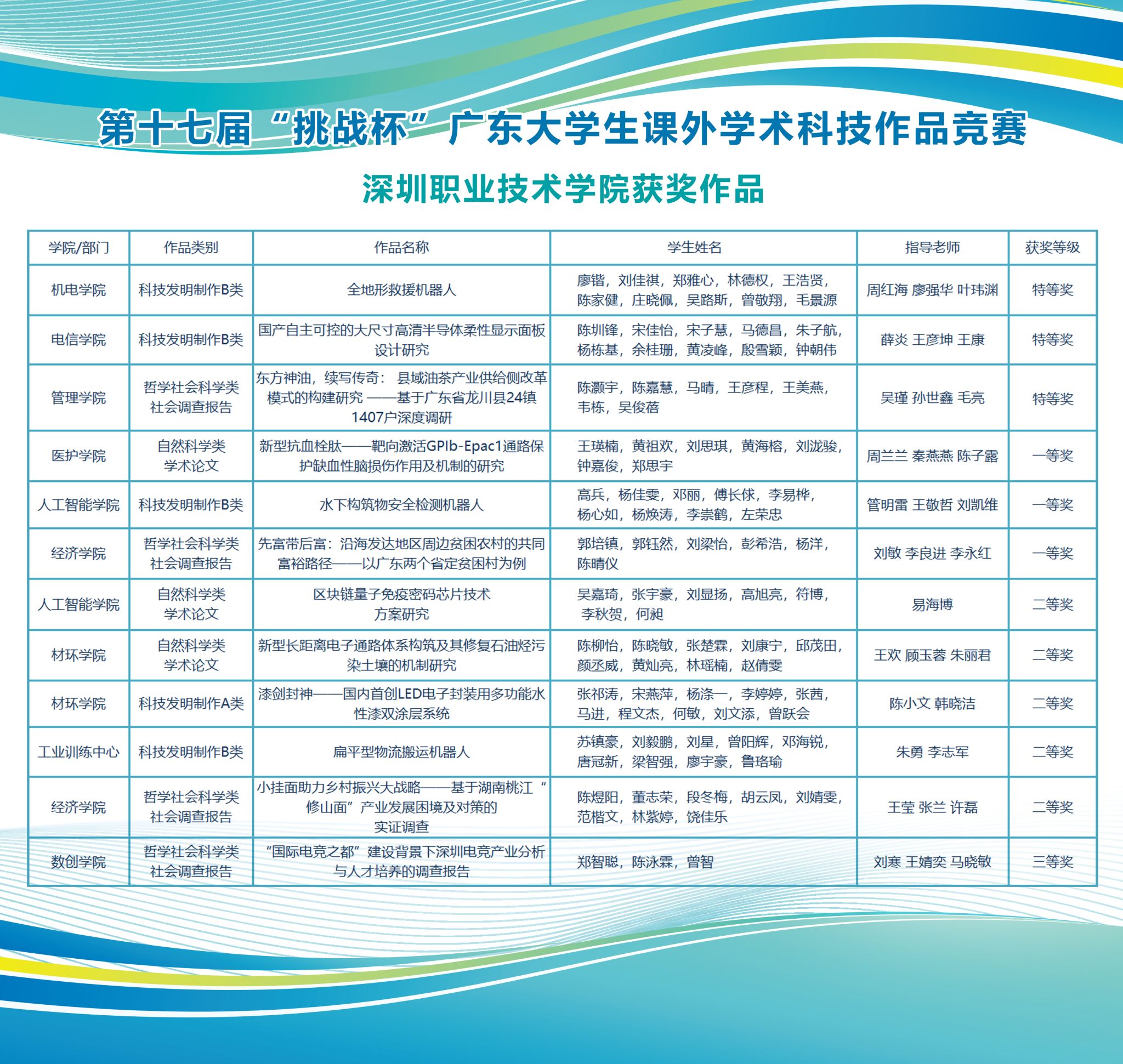 5月27日至28日,由共青團廣東省委員會、廣東省教育廳、廣東省科學技術廳、廣東省科學技術協(xié)會、廣東省社會科學院、廣東省學生聯(lián)合會共同主辦的第十七屆“挑戰(zhàn)杯”廣東大學生課外學術科技作品競賽終審決賽,在中山大學順利舉行。經(jīng)與本科院校同臺競技、激烈角逐,我校獲特等獎3項,一等獎3項、二等獎5項、三等獎1項,捧得“優(yōu)勝杯”。我校參賽作品獲獎率達100%,特等獎數(shù)量位列全省高職院校第一。
