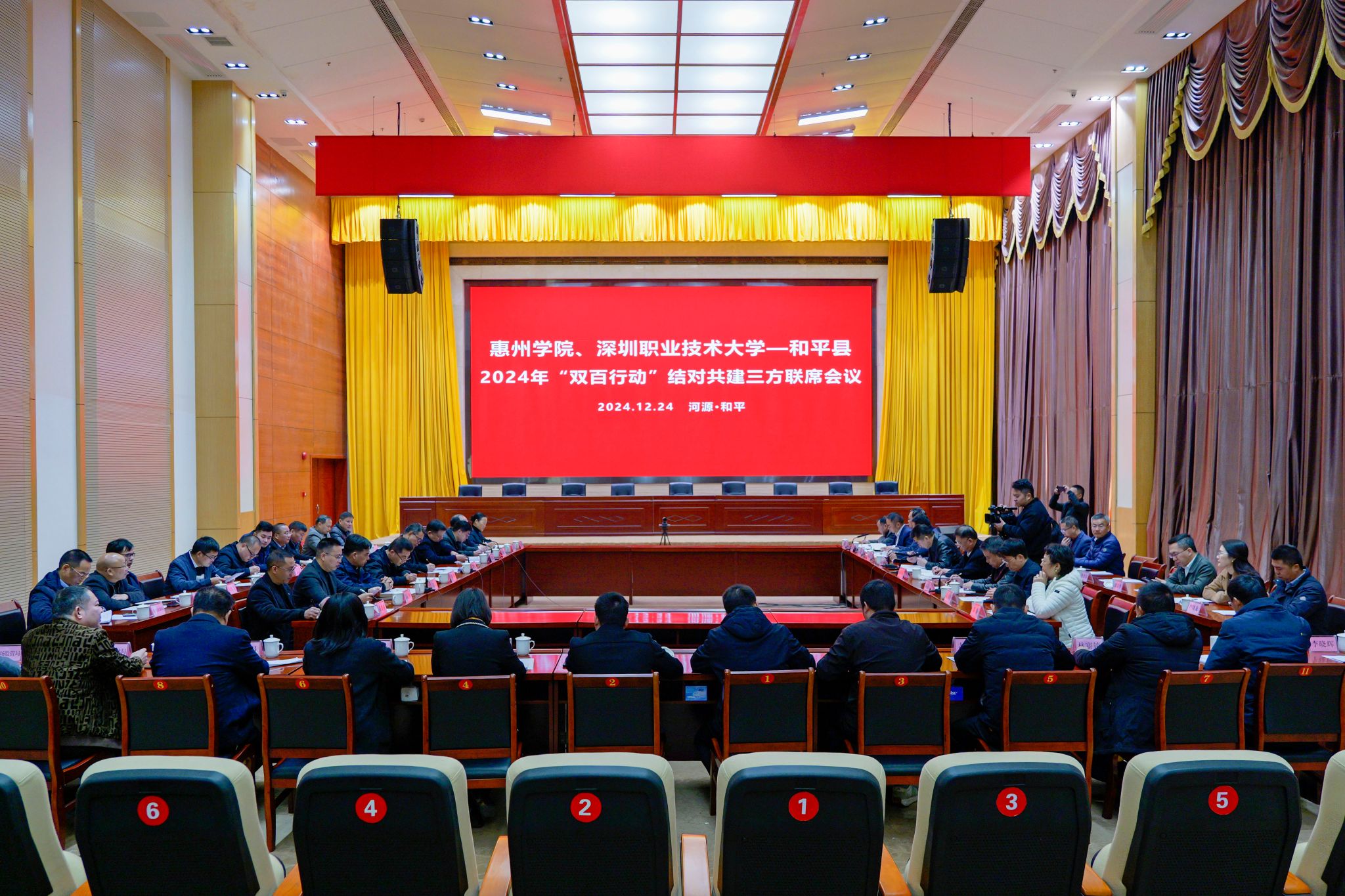 12月24日,惠州學院、深圳職業技術大學與和平縣2024年“雙百行動”結對共建三方聯席會議在和平縣政務中心召開,我校黨委書記楊欣斌,惠州學院黨委書記彭永宏,和平縣委書記鄧卓文、縣長張衍彪等共建單位領導出席會議。會議由張衍彪主持。